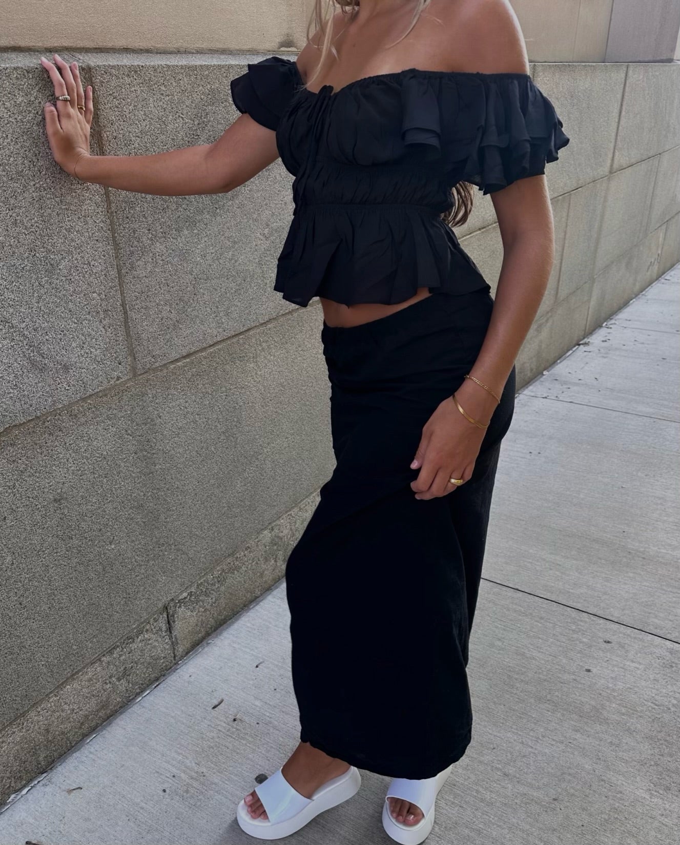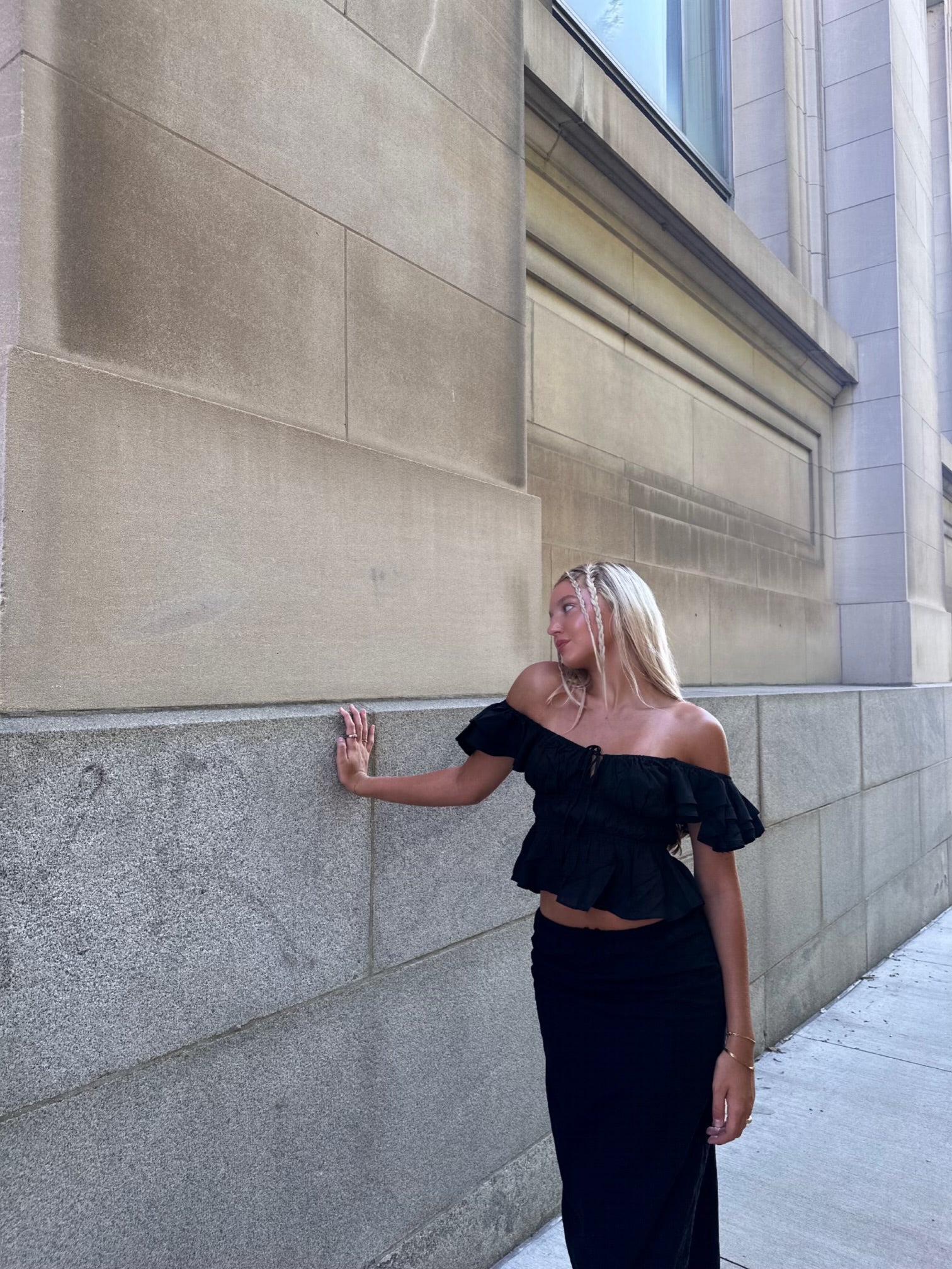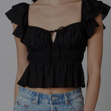 Peplum style top with ruffled capped sleeves, a lot of stretch in material